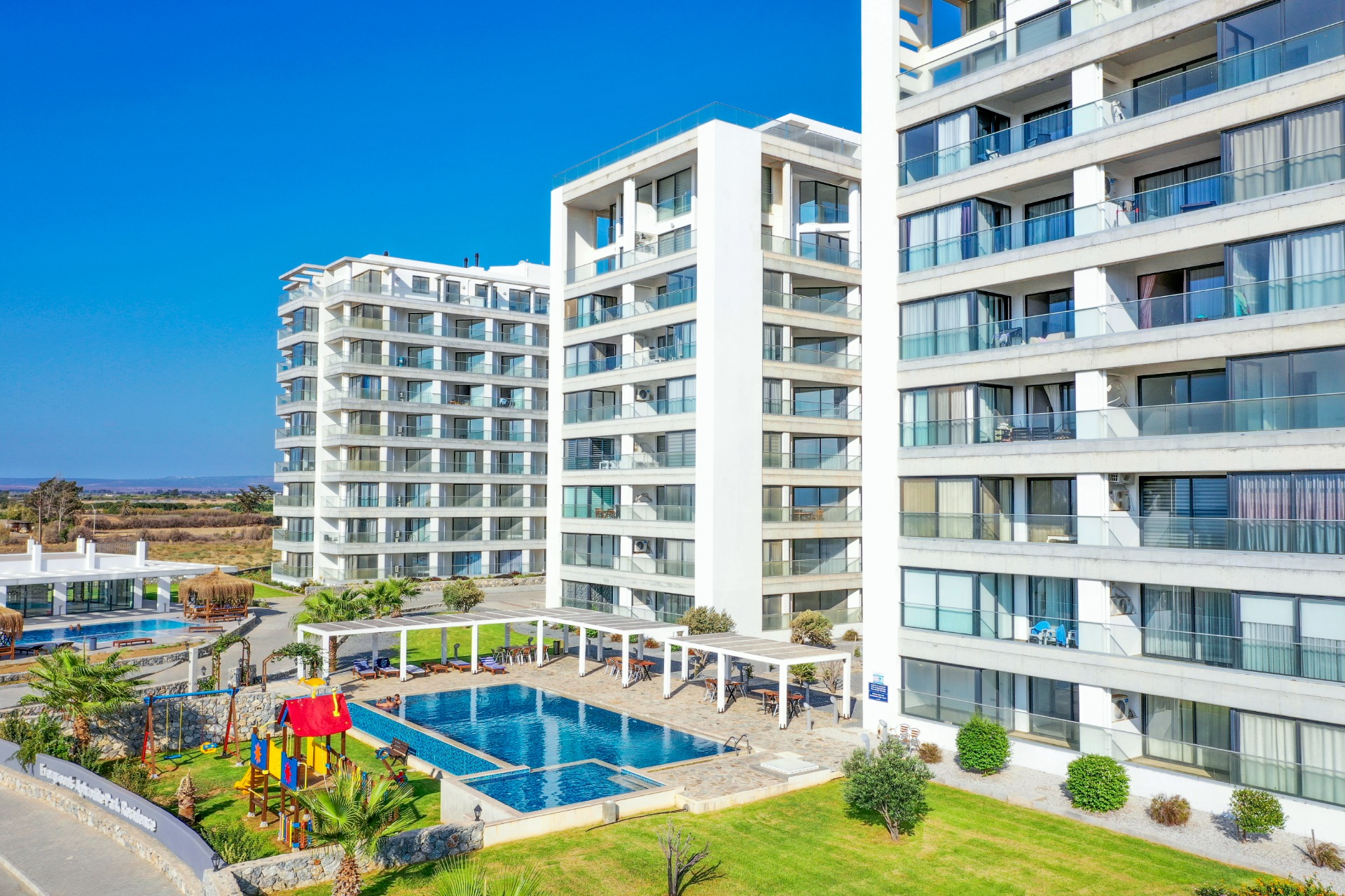 Aphrodite Park Residence je nově dokončená výstavba apartmánů typu 1kk - 3kk ve třech 8patrových blocích, všechny s přímým výhledem na moře, pouhých 400m od moře a sousedící s Aphrodite Beachfront a Aphrodite SPA.